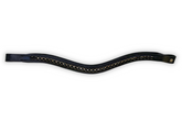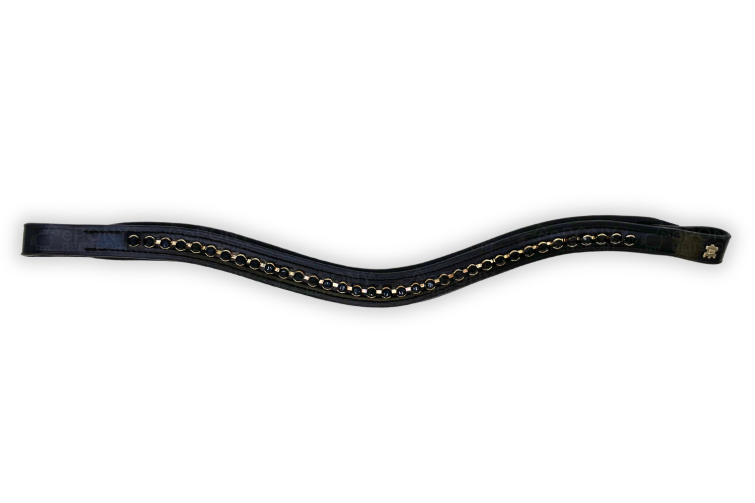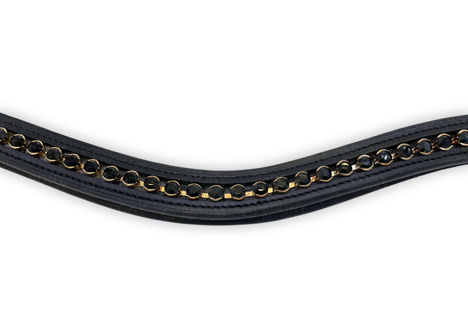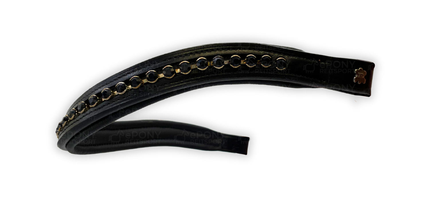 Elegant, dezent und stilvoll! So lässt sich das geschwungene Stirnband mit schwarzen Premium Kristallsteinen aus der Stallmeister Serie von Döbert beschreiben. Das weiche Leder schmiegt sich um den Pferdekopf und das Stirnband ist pferdefreundlich mit einer weichen Polsterung unterlegt. Die schwarzen Premium Kristallsteine sind in einer bronzefarbenen Kettelung stabil eingefasst und treten durch den Farbkontrast besonders luxuriös hervor. Veredle deine Trense mit dem Stallmeister Stirnriemen von Döbert und setzte deinem Pferd die Krone auf.