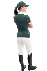 Das figurbetonte Kurzarmshirt Shine ist eine echte Ikone aus der Harcour-Essential-Kollektion im französischen Design. Das dunkelgrüne Turniershirt in Jungle ist mit einem edlen kontrastfarbigen Latz ausgestattet, der besonders bei einer Marscherleichterung zum Vorschein kommt und unter dem Turnierjacket oder Turnierfrack für einen hellen Kontrast sorgt. Das leichte Stretchmaterial ist angenehm auf der Haut und sorgt für Tragekomfort. Durch die kurzen Ärmel ist das Turniershirt Shine ideal für Turnierreiterinnen in den warmen Sommermonaten geeignet. Die kurzen Ärmel sind mit kontrastfarbigen Abschlüssen in Weiß betont.