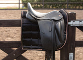 Eine echte Augenweide für Dressurreiter ist die edle Schabracke Satin Denici Cavalli Indigo von Harry’s Horse in einem zeitlosen, eleganten Schwarz. Diese schimmernde Satin Schabracke hat einen klassischen kantigen Schnitt mit einer anatomischen Oberlinie, die genug Platz für den Widerrist mitbringt und das korrekte Kammern beim Satteln.