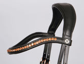Der anatomische Nasenriemen fördert auch eine stabilere Position des Gebisses. Wunderschöne Kristalle in roségold zieren den Nasenriemen auf beiden Seiten.