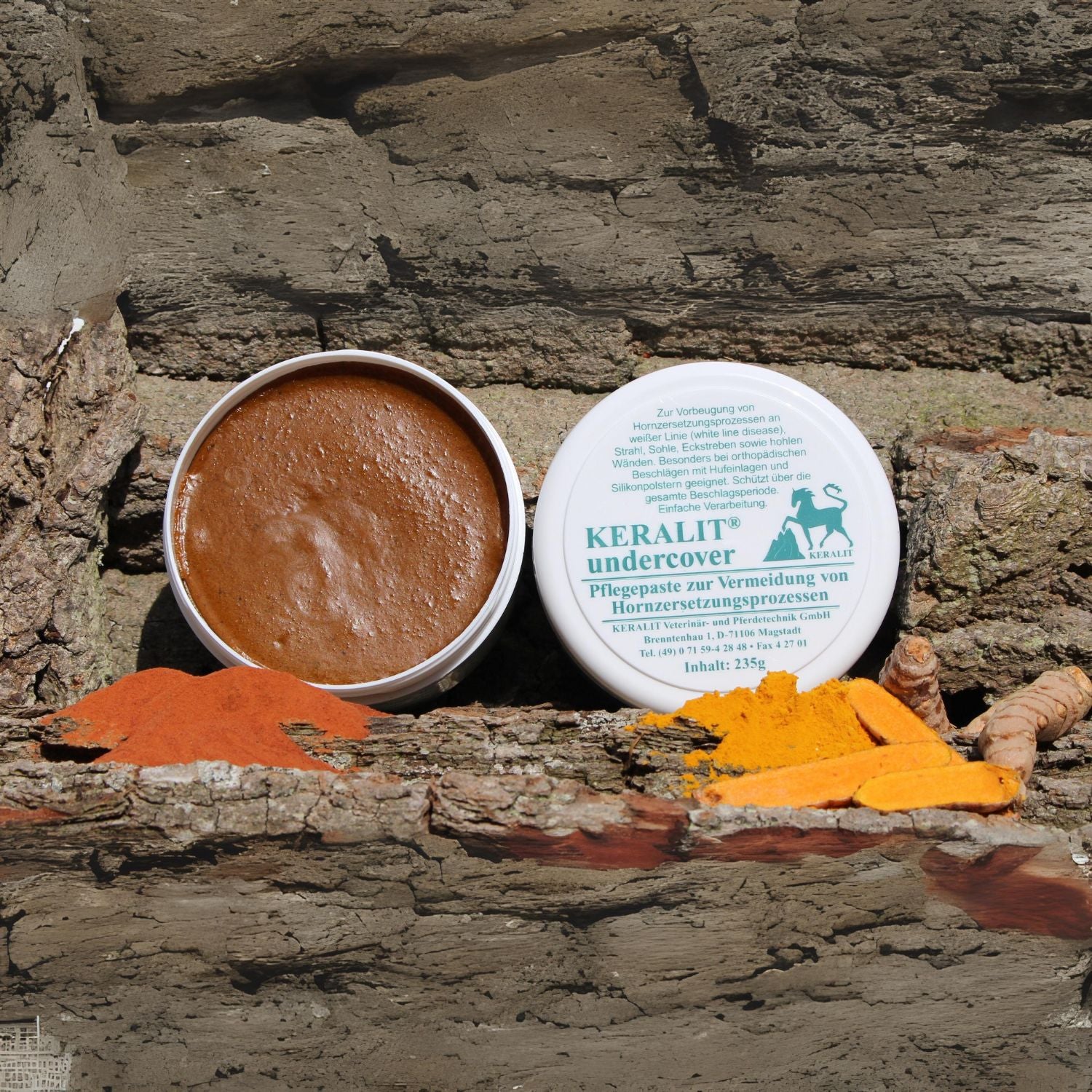 Keralit Undercover ist eine gut anhaftende, feste Hufpflegepaste, bestehend aus pflanzlichen Gewürzen wie Kurkuma und hochdispersen, mineralischen Stoffen sowie Rindenextrakten verschiedener Baumarten wie z.B. Eichenrinde.