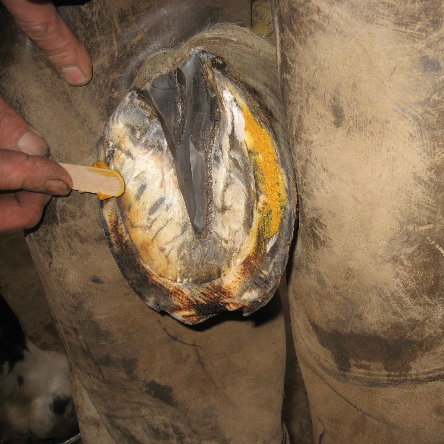Ebenso bei Hornsäulen und hohlen Wänden. Keralitundercover gibt über die gesamte Beschlagsperiode fäulnishemmende Wirkstoffe ab. Vermehrt geschieht dies, wenn von außen Nässe unter den Beschlag gelangt, wie beispielsweise durch das Waschen der Hufe oder auch aus der Einstreu.
