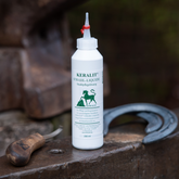 Die Antwort lautet Strahl-Liquide von Keralit! Keralit Strahl-Liquide ist eine flüssige, gut anhaftende Strahlpflegelösung, die speziell für die Problemzonen des Hufstrahls und der Weißen Linie geeignet ist. Die Strahlpflegelösung besteht aus einer wasserlöslichen Kombination mit diversen Gerbstoffen und Salzen. Die Hufpflege des Strahl-Liquides beruht vorwiegend auf einer Änderung des Milieus, welches die hornzersetzenden Keime benötigen, um Stoffwechsel zu betreiben. Diese Keime mögen es am liebsten alkalisch, warm, feucht und anaerob. Durch die dünnflüssige Konsistenz kann das Strahl-Liquide gut und tief in die Strahlfurchen und zerklüftete Hornsubstanz eindringen. Zur Anwendung genügt ein einfaches Benetzen des Hornes mit der Flüssigkeit.