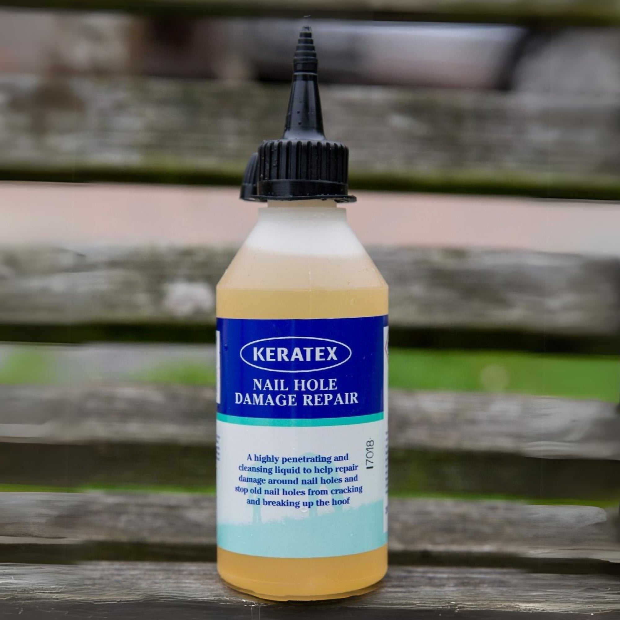 Der Keratex Nail Hole Damage Repair ist eine Reinigungs- und Reparaturlösung, die rissige Nagellöcher reinigt und härtet, so dass der Huf stabilisiert wird. Ponys und Pferde, die regelmäßig beschlagen werden, können unter der Doppelbelastung von alten und neuen Nagellöchern leiden. Nagellöcher stellen auch bei gesunden Hufen immer eine Destabilisierung des Hufhorns dar, so dass bei zusätzlichen Belastungen durch trockene Sommer, Wetterwechsel oder sehr feuchte Jahreszeiten, Risse im Bereich der Nagellöcher auftreten. Diese Risse können mit der Zeit einreißen und für erheblichen Schaden in der Hufwand sorgen.