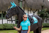Der kurzärmelige Short Sleeve Base Layer von Lemieux leuchtet schon von Weitem in der auffälligen Farbe azure, einem wunderschönen Türkiston. Die Farbe azure wirkt frisch und sorgt für perfekt abgestimmten Auftritt in der Reitstunde, bei Aktivitäten rund ums Pferd oder bei einem Ausritt.