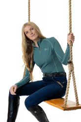 Der langärmlige Base Layer von Lemieux in der Farbe sage, ist ein wunderschönen Farbton in salbeigrün. Die Farbe sage wirkt harmonisch und sorgt für den perfekt abgestimmten Auftritt in der Reitstunde, bei Aktivitäten rund ums Pferd oder bei einem Ausritt.