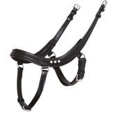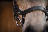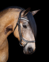Das anatomische Reithalfter von SD Design ist sehr pferdefreundlich und mit schönen Details verziert. Elegantes weiches schwarzes Leder, schwarz unterlegt, mit drei funkelnden Kristallsteinen am Nasenriemen besetzt. Der Nasenriemen verläuft abgerundet / gebogen zum Reithalftertrageriemen über, sodass das Leder nicht über die empfindlichen Nervenaustritte des Pferdeschädels oder auf empfindliche Knochenbereiche drückt. Der obere Schließriemen ist so positioniert, dass kein Druck auf die Backenzähne ausgeübt wird und genügt Raum für eine optimale Lage des Gebiss vorhanden ist.. Der untere Schließriemen verhält sich wie beim hannoveranischem Reithalfter. Das Reithalfter ist beidseitig verstellbar, mit kurzen Reithalfter Trageriemen.