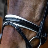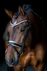 Einzigartiges schwedisch kombiniertes Reithalfter von SD Design mit Glitzerlack in Sonderfarben! Elegantes weiches schwarzes Leder, silbern – metallisch unterlegt, mit schwarzem Glitzerlack und darin eingearbeiteten silbernen Glitzerpartikeln am Nasenriemen. Der weiche Nasenriemen ist mittig circa 5 cm breit und verjüngt sich seitlich auf 3 cm, damit kein Druck auf empfindliche Nerven ausgeübt wird und genug Platz für eine optimale Lage der Gebissringe vorhanden ist. Durch den breiten konischen Nasenriemen erhält das Reithalfter nicht nur eine einzigartige Optik, sondern auch einen pferdefreundlichen Komfort. Das weiche Neopren, mit dem der Nasenriemen gepolstert ist, sorgt für eine optimale Druckverteilung. Das Reithalfter ist beidseitig verstellbar, mit kurzen Reithalfter Trageriemen.