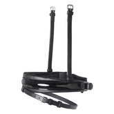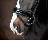 Das schwedisch kombinierte Reithalfter von SD Design ist wirklich sehr stilvoll. Elegantes weiches schwarzes Leder, schwarz unterlegt, mit schwarzem Lack am Nasenriemen ausgeführt. Der weiche Nasenriemen ist mittig circa 5 cm breit und verjüngt sich seitlich auf 3 cm, damit kein Druck auf empfindliche Nerven ausgeübt wird und genug Platz für eine optimale Lage der Gebissringe vorhanden ist. Durch den breiten konischen Nasenriemen erhält das Reithalfter nicht nur eine einzigartige Optik, sondern auch einen pferdefreundlichen Komfort. Das weiche Neopren, mit dem der Nasenriemen gepolstert ist, sorgt für eine optimale Druckverteilung. Das Reithalfter ist beidseitig verstellbar, mit kurzen Reithalfter Trageriemen.