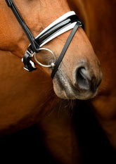 Das schwedisch kombinierte Reithalfter von SD Design ist wirklich sehr stilvoll. Elegantes weiches schwarzes Leder weiß unterlegt, mit schwarzem Lack am Nasenriemen ausgeführt. Der weiche Nasenriemen ist mittig circa 5 cm breit und verjüngt sich seitlich auf 3 cm, damit kein Druck auf empfindliche Nerven ausgeübt wird und genug Platz für eine optimale Lage der Gebissringe vorhanden ist. Durch den breiten konischen Nasenriemen erhält das Reithalfter nicht nur eine einzigartige Optik, sondern auch einen pferdefreundlichen Komfort. Das weiche Neopren, mit dem der Nasenriemen gepolstert ist, sorgt für eine optimale Druckverteilung. Das Reithalfter ist beidseitig verstellbar, mit kurzen Reithalfter Trageriemen.