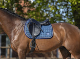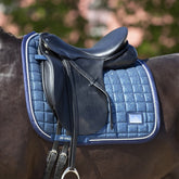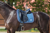 Die neue Hollywood Glamorous Schabracke ist im Gurtbereich mit einem weichen Patch verstärkt, damit der Sattelgurt nicht scheuert oder drückt. Zwei Kordeln, eine kontrastfarbige Kordel in weiß und eine blaue Kordel runden den glamourösen Auftritt ab. Gurtband und Gurtschlaufe sind mit einem Klettverschluss versehen, sodass der Sattelgurt leicht entfernt werden kann. Das edle SD Design Logo befindet sich auf der linken Seite der Schabracke.