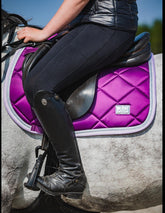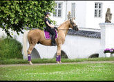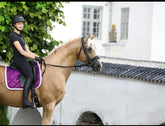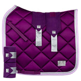 Die Schabracke „My Passion“ in purple dream besticht durch ihre glänzende und elegante Satin-Oberfläche, einer weichen großen Steppung und nicht zuletzt dem breiten funkelnden Glitzer-Banding. Die Farbe purple dream ist ein wunderschöner dunkler Violettton.
