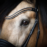 Das Stirnband Diamond Extreme rose gold ist durch zwei schmale Zierkedern mit kleinen rose gold schattierten crystal rocks Kristallsteinen gerahmt, die bei jeder Bewegung im Sonnenlicht glitzern. Mittig sind rose goldene große Kristallsteine in Metallnieten in eine schwarze Lackschicht eingearbeitet. Durch den schwarzen Lack werden die Kristallsteine durch den Farbkontrast und die glänzende Oberfläche besonders betont. Die trendige Farbe rose gold wirkt majestätisch und lässt sich mit verschiedensten Trenseneinzelteilen kombinieren, um eine individuelle SD Design Trense zusammenzustellen. Mit diesem zeitlos schönen, glitzernden Design setzt du deinem Pony oder Pferd die Krone auf. Das mit 2,4 cm relativ breite SD Design Stirnband ist elegant geschwungen und sucht durch die besondere Materialkombination seinesgleichen.