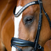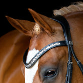 Das Stirnband aus weichem, schwarzen Leder ist elegant geschwungen und schmiegt sich um den Pferdekopf. Das Wechselspiel aus großen und kleinen Kristallsteinen wirkt extrem elegant und im Sonnenlicht funkeln die klaren Kristalle wie ein Meer aus Diamanten.