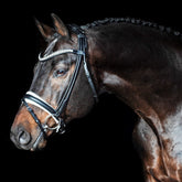 Das schmale und eingefasste, geschwungene Stirnband besteht aus weichem Leder und ist mit hellen Kristallsteinen besetzt. Dieses stilvolle Stirnband harmoniert mit dem Gesamtbild der Trense.