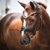 Um eine extrem klare Optik zu erzielen und um auf störende Schnallen an den Backen- oder Seitenstücken zu verzichten, ist die schwedisch kombinierte Trense Fleur im Genick zu verschnallen. Dadurch werden die Kräfte gleichmäßig verteilt. Die rundgenähten Riemen werden schmal und noch eleganter ausgeführt als bisher.