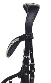 Auch an Kehlriemen und an den Backenstücken sind an den Schiebeschlaufen jeweils auf beiden Seiten zwei Kristallsteine eingearbeitet.