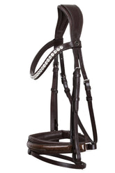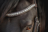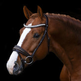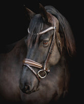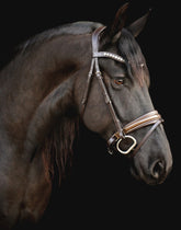 Das geschwungene Stirnband ist mit großen, glitzernden Rivoli-Kristallen besetzt. Der Zaum wurde unter Berücksichtigung der Anatomie des Pferdes entwickelt und wird mit einem neuen, speziell angefertigten, extra weichen Genickstück geliefert. Dieses Genickstück hat eine größere Kontaktfläche, wodurch der Druck auf das empfindliche Genick / die empfindlichen Nerven erheblich minimiert wird.