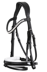 Das geschwungene Stirnband ist mit großen, glitzernden Rivoli-Kristallen besetzt. Der Zaum wurde unter Berücksichtigung der Anatomie des Pferdes entwickelt und wird mit einem neuen, speziell angefertigten, extra weichen Genickstück geliefert. Dieses Genickstück hat eine größere Kontaktfläche, wodurch der Druck auf das empfindliche Genick / die empfindlichen Nerven erheblich minimiert wird.