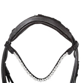 Das geschwungene, schmale Stirnband ist mit großen und kleinen klaren Kristallsteinen in einer einzigartigen Anordnung ausgeführt. Die großen und kleineren Kristallsteine sind inselartig zu jeweils drei Steinen angeordnet, was für einen atemberaubenden Glitzereffekt sorgt. Unvergleichbar mit allen anderen Stirnbändern! Die Kristallsteine funkeln bei jeder Bewegung deines Ponys oder Pferdes im Sonnenlicht. Dadurch wird die klare und luxuriöse Optik dieser rundgenähten SD Design Trense perfektioniert.