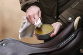 ZEDAN Lederfett sparsam mit einem Baumwolltuch oder einer Auftragsbürste in das Leder einmassieren. Nach einigen Minuten das aufgetragene Fett nochmals einmassieren. Durch die entstehende Wärme dringt es tief in das Leder ein, macht es geschmeidig und imprägniert es nachhaltig. Handwarm lässt sich das Lederfett leichter auftragen. Überschüssiges Fett nach einiger Zeit mit einem saugfähigen Baumwolltuch aufnehmen. Nicht zu dick auftragen!